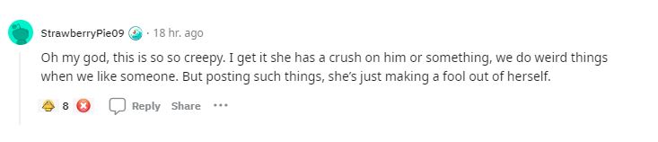 एक अन्य यूजर ने लिखा, “ओह माय गॉड, ये बहुत ही घटिया हरकत है। मैं समझ गई कि उन्हें ऋषभ पर क्रश है, हम सब अतरंगी हरकतें करते हैं जब हम किसी को पसंद करते हैं। लेकिन इस तरह का पोस्ट डालना, खुद का उल्लू साधने जैसा है”। सोशल मीडिया पर कई यूजर्स ने उर्वशी को स्टॉकर का टैग दे दिया।