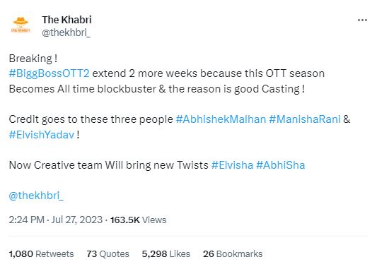 हाल ही में द खबरी ने अपने ट्विटर अकाउंट पर जानकारी देते हुए बताया कि बिग बॉस ओटीटी सीजन 2 दो हफ्तों के लिए और एक्सटेंट हो रहा है। इससे पहले पूजा भट्ट भी बीते एपिसोड में ये कहते हुए नजर आई थीं कि 18-20 दिन तक शो चलने की बात कहते हुए नजर आई थीं।