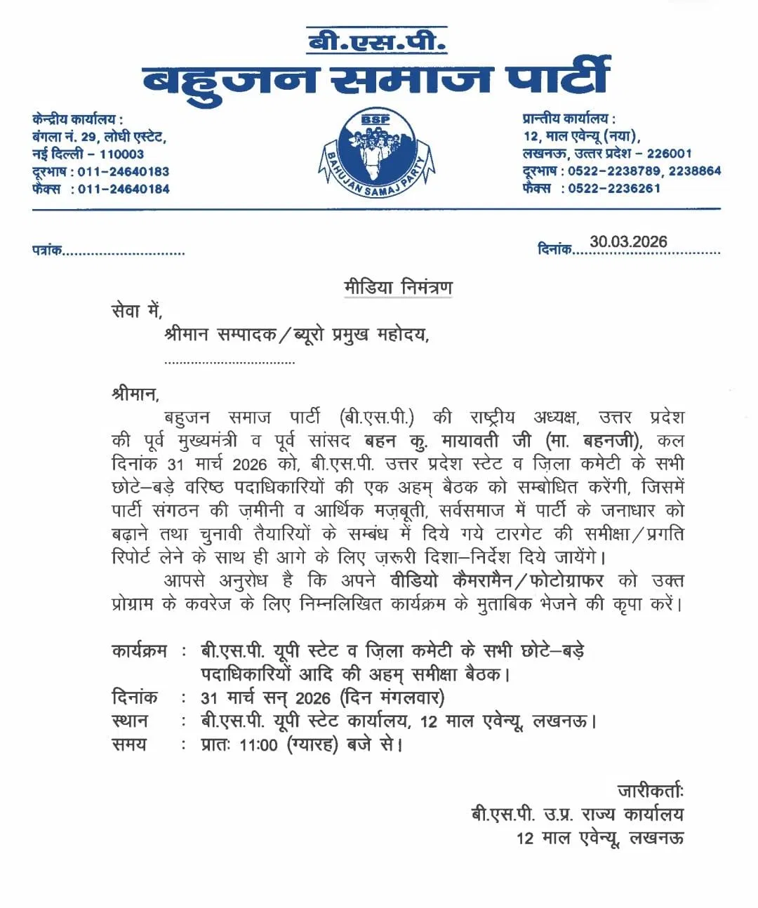 बसपा प्रमुख ने लखनऊ में पदाधिकारियों की बैठक बुलाई है, जिसमें संगठन की मजबूती, आर्थिक स्थिति और जनाधार बढ़ाने पर चर्चा होगी आगामी चुनावों की तैयारियों की समीक्षा के साथ प्रगति रिपोर्ट ली जाएगी।