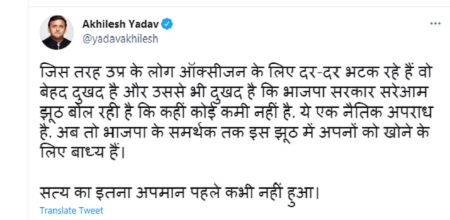समाजवादी पार्टी के राष्ट्रीय अध्यक्ष उत्तर प्रदेश के पूर्व मुख्यमंत्री अखिलेश यादव ने मंगलवार को अपनी पीड़ा पर एक ट्वीट किया है। अखिलेश यादव ने लिखा है कि उत्तर प्रदेश में लोग मेडिकल ऑक्सीजन के लिए दर-दर भटक रहे हैं। खाली सिलेंडर लेकर यह लोग भीषण गर्मी में या तो ऑटो या फिर रिक्शा में बैठकर लम्बी दूरी तय कर रहे हैं, लेकिन इनको मेडिकल ऑक्सीजन उपलब्ध नहीं हो पा रही है।