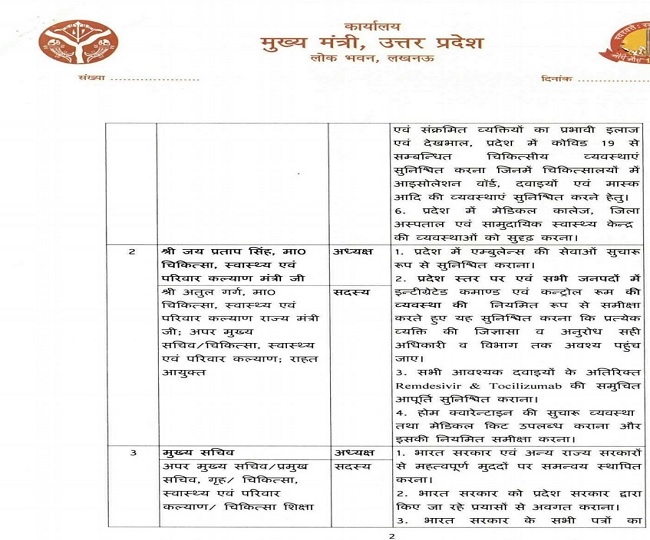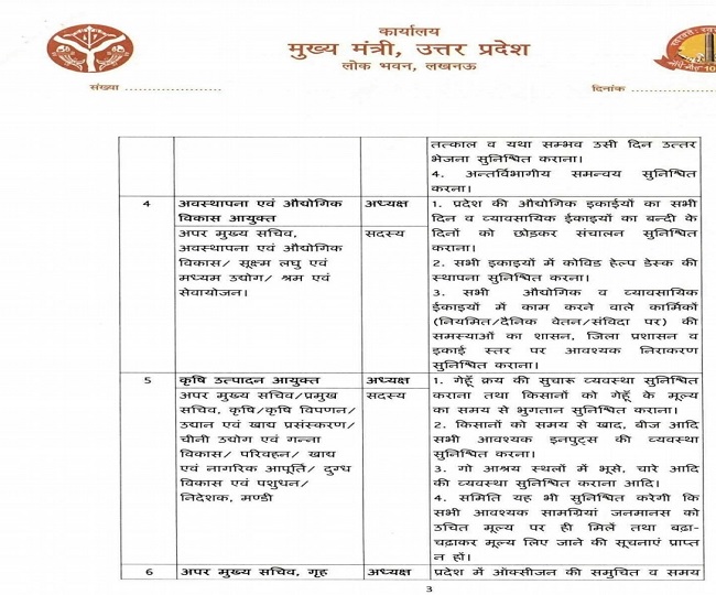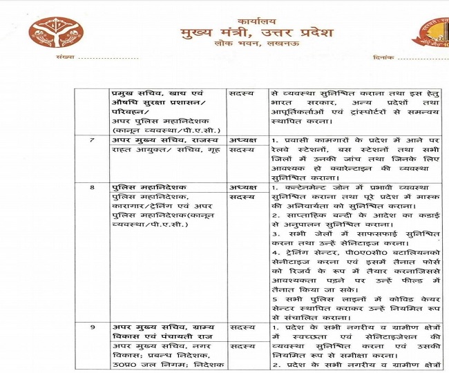 यह टीम स्वच्छता, फॉगिंग, सैनिटाइजेशन और निगरानी समितियों की मॉनिटरिंग करेगी। इसी प्रकार कृषि उत्पादन आयुक्त की जवाबदेही गन्ना, खाद्यान्न वितरण, पशुपालन और कृषि आदि संबंधित कार्यों के सुचारू क्रियान्वयन की होगी। आठवें सदस्य के रूप में आईआईडीसी होंगे, यह प्रदेश में औद्योगिक गतिविधियों के सुगम क्रियान्वयन के लिए जिम्मेदार होंगे। औद्योगिक इकाइयों से इनका सीधा संवाद होगा। नौवीं सदस्य के रूप के एसीएस राजस्व को शामिल किया गया है। यह प्रवासी श्रमिकों से जुड़े प्रबंधन के प्रति जिम्मेदार होंगी। इसके अतिरिक्त, अपर मुख्य सचिव सूचना टीम-09 के साथ समन्वय स्थापित करते हुए जनहित में व्यापक प्रचार-प्रयास सुनिश्चित कराएंगे।