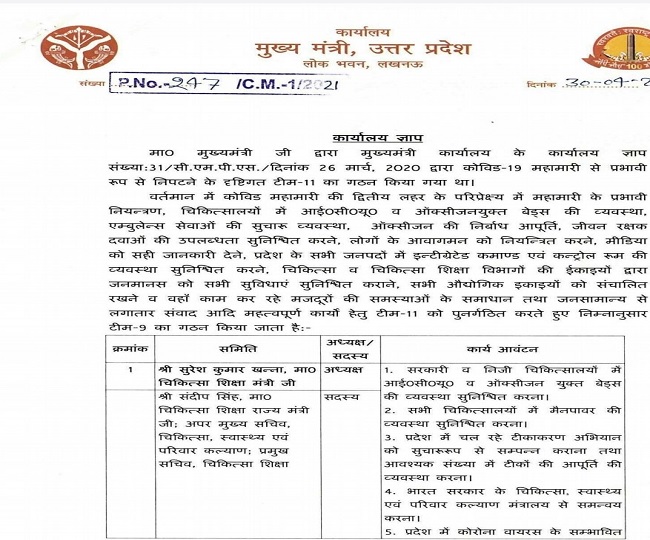 सीएम योगी आदित्यनाथ ने टीम-9 को पुनर्गठन किया है। टीम-11 की जगह अब टीम-9 संक्रमण के खिलाफ जंग में खड़ी होगी। इसमें चिकित्सा शिक्षा मंत्री सुरेश कुमार खन्ना और चिकित्सा एवं स्वास्थ्य मंत्री जय प्रताप सिंह टीम-9 के सभी अध्यक्षों की काम का परीक्षण करने के बाद सीएम योगी आदित्यनाथ के साथ समीक्षा बैठक में शामिल होंगे। अब सभी नौ समितियों को कोरोना वायरस के खिलाफ जंग में अलग-अलग काम बांटे गए हैं। सभी 9 समितियों के अध्यक्ष मुख्यमंत्री को रोजाना रिपोर्ट करेंगे। सीएम योगी आदित्यनाथ ने टीम 11 को पुनर्गठित करते हुए कार्यों और शक्तियों का विकेंद्रीकरण किया है। अब कोविड नियंत्रण के लिए चिकित्सा शिक्षा मंत्री सुरेश कुमार खन्ना और स्वास्थ्य मंत्री जय प्रताप सिंह के नेतृत्व में अफसरों की टीम काम करेगी। सीएम योगी आदित्यनाथ का निर्देश है कि अब अलग-अलग अफसरों की जवाबदेही भी तय होगी।