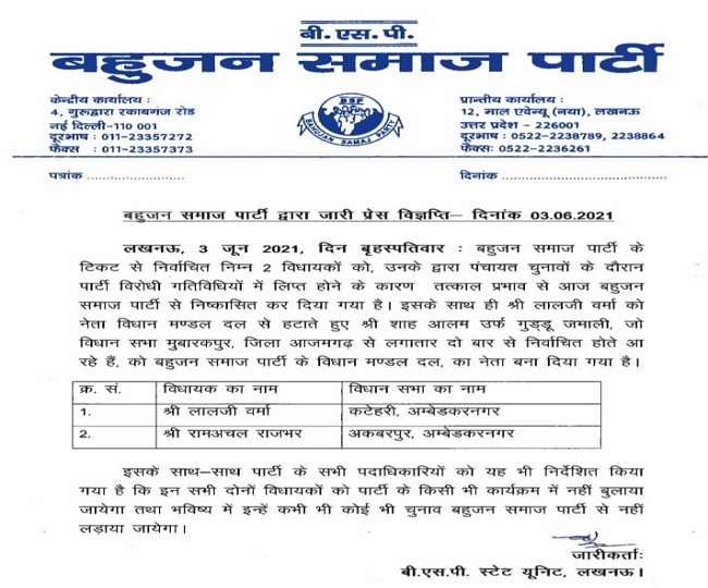 उत्तर प्रदेश की पूर्व मुख्यमंत्री मायावती को शिकायत मिली थी कि अम्बेडकर नगर में लालजी वर्मा और राम अचल राजभर ने जिला पंचायत चुनाव में पार्टी के अधिकृत प्रत्याशियों का साथ नहीं दिया है। इन दोनों पर पंचायत चुनाव में पार्टी से धोखा करने का आरोप लगाकर मायावती ने बाहर का रास्ता दिखा दिया है। लालजी वर्मा और राम अचल राजभर अभी भी बसपा से विधायक हैं और दोनों का पार्टी में काफी बड़ा कद था। लालजी वर्मा तो प्रदेश में बसपा की हर सरकार में मंत्री रहे हैं। उनके शुक्रवार तक समाजवादी पार्टी में भी शामिल होने के कयास लगाए जा रहे हैं।
